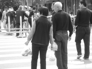 ?。翟拢保谷丈衔纾保啊茫常埃袇^(qū)八一路與育新街交叉口,兩位老人購(gòu)物結(jié)束,手拎塑料袋,正在等候通過(guò)馬路。
