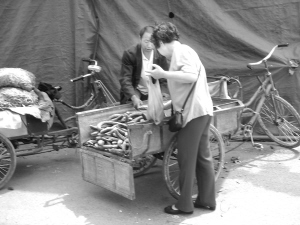 中午12點(diǎn)多,正是下班的高峰期,六一路與育新街交叉口的菜市場(chǎng)熱鬧非凡。記者在蔬菜攤上翻檢幾個(gè)西紅柿,旁邊一位女士買(mǎi)了足有十幾根黃瓜,小販拿出一個(gè)大大的紅色塑料袋,怕袋子不結(jié)實(shí),還又套上一個(gè)。我笑問(wèn):“塑料袋不要錢(qián)???”賺回一個(gè)大大的白眼:“要錢(qián)你給么?”旁邊的小販趕忙說(shuō):“咱這又不是超市,不要錢(qián)!”結(jié)賬時(shí),我同樣也獲贈(zèng)一個(gè)塑料袋,不算太薄,不過(guò)有股刺鼻的塑料味。