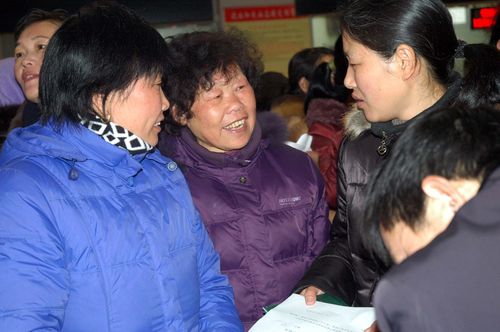 “4050”應聘人員在互相交流求職信息。(記者?王映?攝)