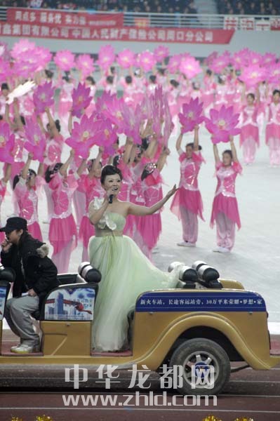 隨后,一群身穿棉花、高粱造型服裝的演員也涌入表演場地,他們表演的舞蹈同樣得到了觀眾的認可。周口籍著名歌手朱妍(如圖)演唱的《秋水伊人》把本章文體表演再次推向高潮,看臺上,觀眾拍照的閃光燈不時閃爍。