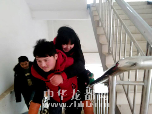 ????雷偉每隔幾天就背一次孔雪珂,這已成了他學(xué)校生活的一部分?!俺宋冶晨籽╃嫔舷聵峭?,我們班其他26個(gè)男生也都背過她。我作為班長(zhǎng),理應(yīng)多做一些。”把孔雪珂安全送到教室,雷偉有點(diǎn)不好意思地說,“第一次背她,我有點(diǎn)兒害羞,但如今已經(jīng)習(xí)慣了?!?/p>