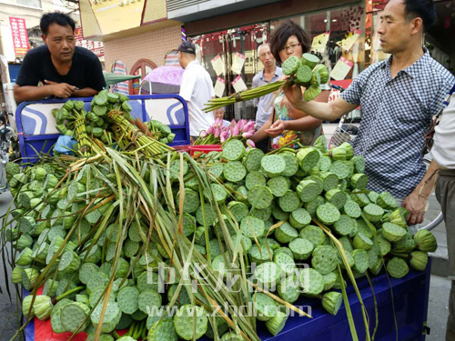 ????7月25日上午,在周口中心城區(qū)六一路上,一些流動攤販正在販賣荷花、蓮蓬,縷縷清香沁人心脾,引得不少市民爭相購買。晚報(bào)記者 朱海龍 攝