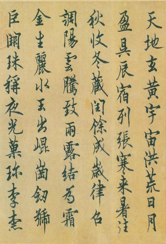 ????《千字文》全書共250句。每四字一句,四句一組,兩組一韻,前后貫通,互不重復(fù)。其內(nèi)容涉及天文、地理、歷史、農(nóng)工、園藝、飲食起居、修身養(yǎng)性及封建綱常禮教等各個(gè)方面。包羅萬(wàn)象,涵蓋面廣泛,其最大優(yōu)點(diǎn)又在于融知識(shí)性、可讀性和教化性為一爐,誦讀一遍即感到文采斐然,合轍押韻,瑯瑯上口,易誦易記,梁武帝讀后,龍顏大悅,興奮不已。立即命令刻印,作為“諸王”的習(xí)誦課本,并刊諸于世,為初學(xué)者入門教本。從此,不僅中國(guó)帝王之家有了一本集識(shí)字、書法和思想內(nèi)容為一體的啟蒙讀物,而且中國(guó)社會(huì)乃至世界教育史上也有了問(wèn)世最早、流傳最久、影響最大的蒙學(xué)教材。