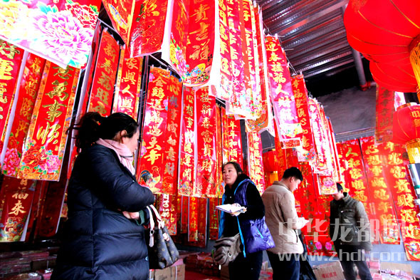 ????????近日在周口華耀城春聯(lián)批發(fā)市場(chǎng)小商販忙著進(jìn)貨,市民精心選購。