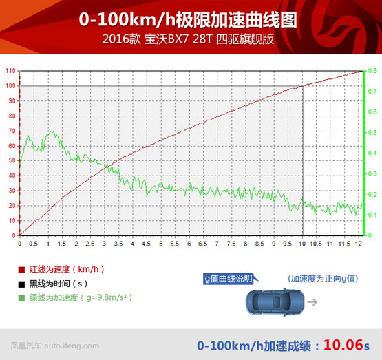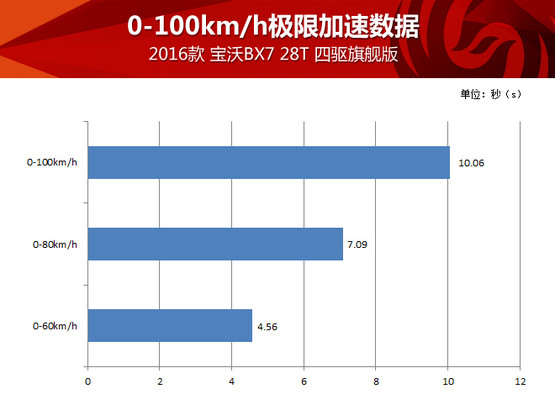 由于有四驅(qū)系統(tǒng)保障,寶沃BX7四驅(qū)版車型在全力加速起步瞬間非常平穩(wěn),6AT變速器換擋還是平穩(wěn)優(yōu)先,所以全力加速時升檔也沒有太明顯的頓挫、動力中斷或者不平順,整個過程很舒服,而10秒出頭的測試成績對于這臺2.0T動力的中型SUV也很不錯,請別忘了因?yàn)榕c變速器的匹配,這臺2.0T發(fā)動機(jī)的扭矩被限制在300牛頓·米,也就是說這臺“高功率”發(fā)動機(jī)其實(shí)并沒使出全力,我們完全有理由相信解除封印后它理應(yīng)跑得更快。