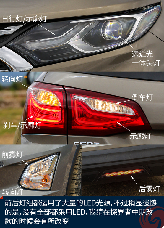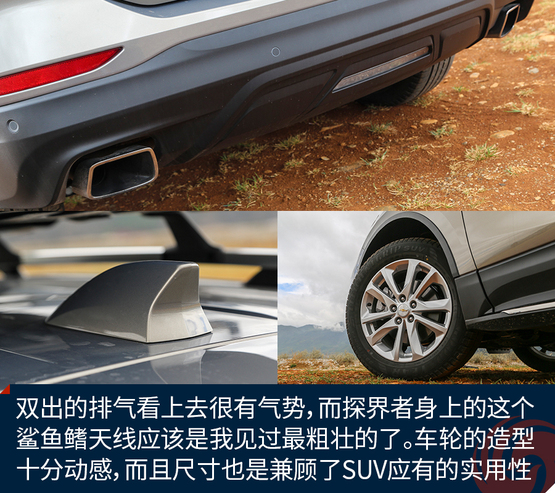 外觀上令我印象深刻的地方有這么幾個(gè),首先前后燈組都運(yùn)用了大量的LED光源,不過稍顯遺憾的是,沒有全部都采用LED,我猜在探界者中期改款的時(shí)候會(huì)有所改變。四個(gè)車門下部包邊的設(shè)計(jì)能夠減少下車弄臟褲腿時(shí)的尷尬。車頂?shù)男欣罴苷娴目捎茫覔?jù)說早期購(gòu)買探界者的朋友還能獲得車頂?shù)男欣钕?,十分?shí)用。雙出的排氣看上去很有氣勢(shì),而探界者身上的這個(gè)鯊魚鰭天線應(yīng)該是我見過最粗壯的了。車輪的造型十分動(dòng)感,而且尺寸也是兼顧了SUV應(yīng)有的實(shí)用性。