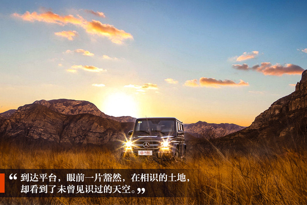 而當(dāng)?shù)竭_(dá)平臺,眼前一片豁然,夕陽與孤鶩齊飛,落霞共水天一色,那是種天旋地轉(zhuǎn)的廣闊,風(fēng)起云涌的震撼,在相識的土地,卻看到了未曾見識過的天空。這難道不算完成了一次逐夢?你雖然沒有進行跨越大洲式的穿越,但在家門口感受到了新的洗禮。而助推你完成使命的是這臺G 63 AMG,除了擁有傲人的動力,強勢的三把機械鎖,讓你知道遇到艱難險阻,它有能力依靠自身脫困。