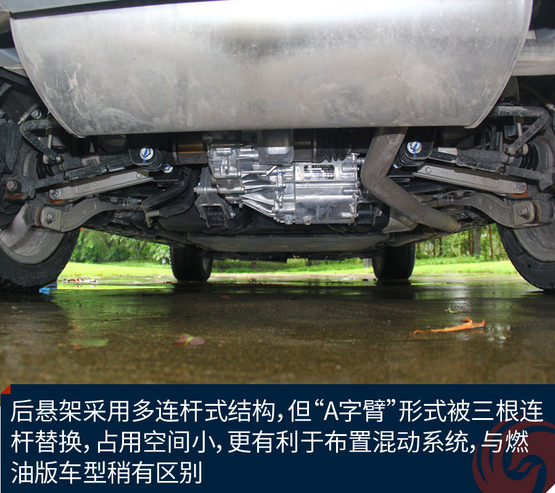 ????????由于電池放置在車(chē)輛的底盤(pán)和后備廂底部,降低了最小離地間隙。后懸架采用多連桿式結(jié)構(gòu),但“A字臂”形式被三根連桿替換,占用空間小,更有利于布置混動(dòng)系統(tǒng),與燃油版車(chē)型稍有區(qū)別。