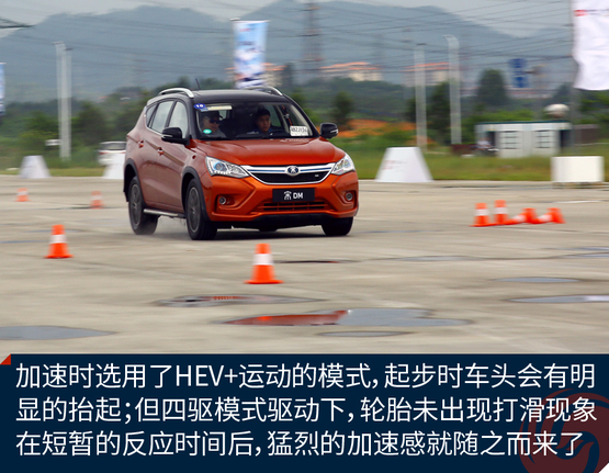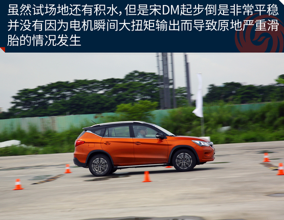 ????????為了充分體驗(yàn)宋DM的加速能力,我們?cè)谠囻{場(chǎng)地對(duì)其進(jìn)行了試駕體驗(yàn)。雖然試駕前一天下過(guò)雨,場(chǎng)地還有積水,但是宋DM起步倒是非常平穩(wěn)。并沒(méi)有因?yàn)殡姍C(jī)瞬間大扭矩輸出而導(dǎo)致原地嚴(yán)重滑胎的情況發(fā)生。經(jīng)過(guò)分析,出現(xiàn)這種情況的原因可能是宋DM全系標(biāo)配了ESP車(chē)輛穩(wěn)態(tài)控制系統(tǒng),因此在起步時(shí)或者濕滑路面上行駛也能保證平穩(wěn);另一個(gè)原因是宋DM搭配了全時(shí)電四驅(qū),車(chē)輛前后軸上各搭載有電機(jī),四輪驅(qū)動(dòng)讓車(chē)輛的動(dòng)力輸出更順暢和均衡。
