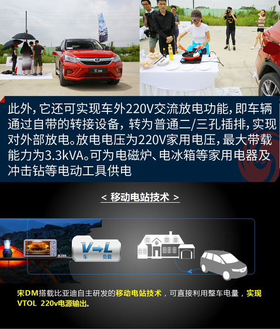 ????????宋DM可實(shí)現(xiàn)車(chē)外220V交流放電功能(VTOL),即車(chē)輛可通過(guò)自帶的轉(zhuǎn)接設(shè)備, 轉(zhuǎn)為普通二/三孔插排,實(shí)現(xiàn)對(duì)外部用電器放電。放電電壓為220V家用電壓,最大帶載能力為3.3kVA,給日常家用電器供電一點(diǎn)沒(méi)問(wèn)題。