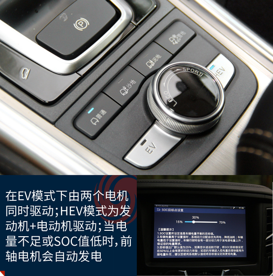 EV的純電模式下車(chē)輛由前后兩個(gè)電機(jī)同時(shí)驅(qū)動(dòng);在HEV的混動(dòng)模式下發(fā)動(dòng)機(jī)和雙電機(jī)都會(huì)提供動(dòng)力驅(qū)動(dòng)車(chē)輛;當(dāng)電量不足時(shí),前電機(jī)則轉(zhuǎn)變成發(fā)電機(jī),發(fā)動(dòng)機(jī)通過(guò)前電機(jī)為電池充電,同時(shí)也為前輪提供動(dòng)力,此時(shí)車(chē)輛由發(fā)動(dòng)機(jī)和后電機(jī)同時(shí)驅(qū)動(dòng)。