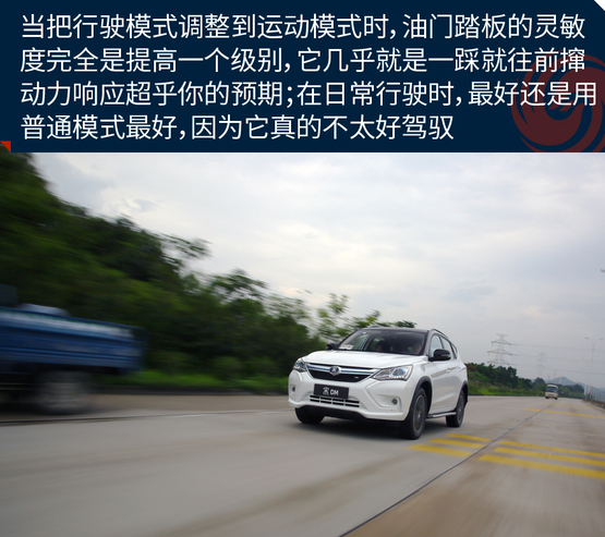 ????????在混合動(dòng)力模式下,將駕駛模式調(diào)整為SPORT模式,由于起步階段是電機(jī)發(fā)力,因此并不像汽油車(chē)那樣靠吊轉(zhuǎn)速來(lái)獲得最大的扭矩。此時(shí),你只需將油門(mén)踩到底,任由宋DM的電機(jī)和發(fā)動(dòng)機(jī)發(fā)力就行,而大扭矩帶來(lái)的直接體驗(yàn)就是,身體像是被摁壓在座椅上,任由車(chē)輛來(lái)讓我體驗(yàn)G值給身體所帶來(lái)的快感,而這種“變態(tài)”的加速感體驗(yàn)確實(shí)是非常的過(guò)癮;可當(dāng)你還在意猶未盡地回味這速度高潮的時(shí)候,不知不覺(jué)就到了該踩剎車(chē)的節(jié)點(diǎn)。