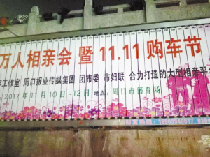 ????據了解,周口萬人相親會是由市委組織部青年工作辦公室、共青團周口市委、市婦聯(lián)、周口報業(yè)傳媒集團聯(lián)合主辦的大型相親平臺。為再一次給廣大消費者搭建更好的選車、購車平臺,周口報業(yè)傳媒集團決定于11月10日至12日在市體育場隆重舉辦2017周口萬人相親會暨“雙十一”購車節(jié)。