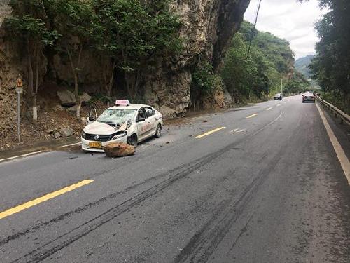 ????14日下午2點(diǎn)多,一名教練帶著學(xué)員在山間練車,突然遇到落石。所幸沒有人員傷亡,所有人都逃出了車外。