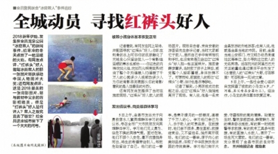 1月3日,中央電視臺新聞頻道《新聞直播間》欄目報道此事。一時間,“紅褲頭”救人的事跡,在金昌市乃至整個甘肅省引起了強烈的反響。在官方微信平臺上,有上百條留言,大多是為“紅褲頭”小哥點贊的。不少人希望找到這個不愿留名的英雄。為此,《金昌日報》以及當(dāng)?shù)孛襟w紛紛發(fā)起“尋找紅褲頭好人”“尋找冰窟救人的無名英雄”的尋人啟事。