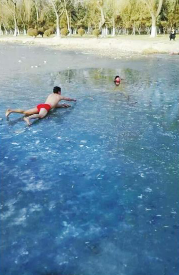 “紅褲頭”小哥脫掉冬衣爬冰救人