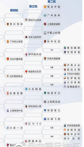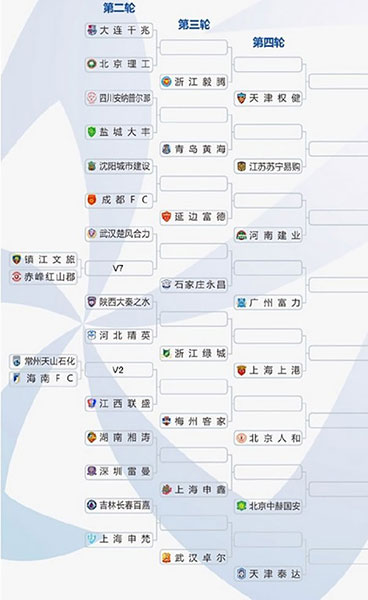 第四輪開始16支中超球隊加入角逐,加上從第三輪晉級的16支球隊,共32支球隊參賽,中超球隊自動落位相應(yīng)客場簽位,其中廣州恒大、上海申花、上海上港和天津權(quán)健4支亞冠球隊將分別落位在A、B、C、D區(qū),這4支球隊在半決賽之前不會相遇。