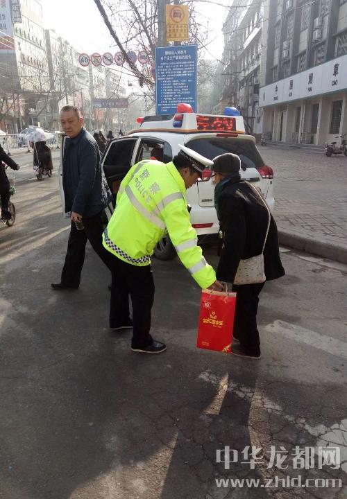 3月10日早上,鄲城縣交警大隊(duì)城市一中隊(duì)隊(duì)長范慶華、指導(dǎo)員徐錕帶隊(duì)按照日常工作安排,在新華路與文化路口站崗執(zhí)勤時(shí),看到一位腿腳不便的八旬老人拄著拐杖,手里還提著一箱火腿腸,行動非常緩慢來到路口。