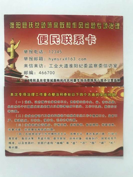 今年4月,淮陽縣扶貧領(lǐng)域腐敗和作風(fēng)問題專項(xiàng)治理全面啟動。為確保專項(xiàng)治理取得實(shí)效,縣紀(jì)委監(jiān)委印制發(fā)放“便民聯(lián)系卡”,進(jìn)一步加大宣傳力度,暢通信訪舉報(bào)渠道。他們統(tǒng)一制作的扶貧領(lǐng)域腐敗和作風(fēng)問題專項(xiàng)治理便民聯(lián)系卡,上面印有專項(xiàng)治理工作重點(diǎn)整治和查處的4個方面內(nèi)容。具體包括黨委、政府履行主體責(zé)任不力,脫貧攻堅(jiān)工作不扎實(shí),敷衍應(yīng)付;扶貧部門及相關(guān)職能部門脫貧攻堅(jiān)工作中不作為、慢作為、亂作為等;扶貧領(lǐng)域發(fā)生貪污侵占,虛報(bào)冒領(lǐng),截留挪用等問題。聯(lián)系卡公布了舉報(bào)電話和來信來訪地址,方便群眾對黨員干部和部門的監(jiān)督。