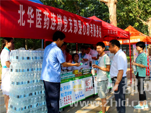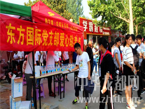 愛心助考活動現(xiàn)場,西華縣真愛醫(yī)院黨支部設立的“黨旗引領、護航高考”的大紅愛心助考條幅分外惹眼,黨員志愿者們免費為考生提供藿香正氣水、風油精、退燒藥等,并有醫(yī)護人員現(xiàn)場提供急救服務。在西華縣恒生醫(yī)院黨支部愛心助考點前,3名醫(yī)護人員正在免費為考生及家長提供風油精、清涼油、仁丹、藿香正氣水等防暑降溫藥品和急救藥品,還有擔架、120急救車輛等。西華縣北華醫(yī)藥黨支部愛心助考服務站的黨員志愿者,正在向考生免費提供防暑降溫藥、感冒發(fā)燒藥、拉肚子藥等藥品。黨員志愿者愛心企業(yè)代表宋女士說:“在高考期間,我們?yōu)榭忌凹议L免費提供礦泉水、芭蕉扇、清涼油等多項服務,除了愛心,更多的是一份責任和使命。”