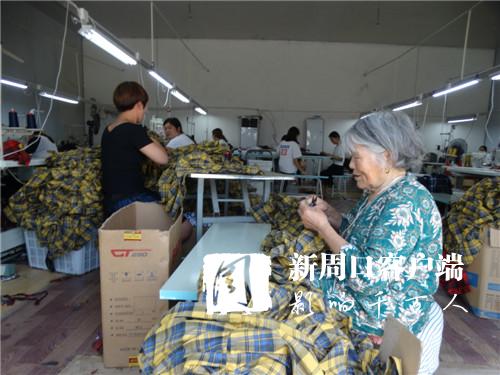 8月12日,在沈丘縣周營鎮(zhèn)歐營村一家服飾有限公司,當地的留守婦女正在加工訂單服裝。