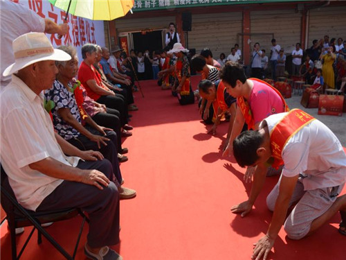 鄉(xiāng)長(zhǎng)吳國(guó)鋒發(fā)表了熱情洋溢的致辭。他首先代表平店鄉(xiāng)黨委、政府、人大向受到表彰的先進(jìn)模范和先進(jìn)家庭表示熱烈的祝賀并致以崇高的敬意。并詳細(xì)闡述了開(kāi)展“孝善敬老讓愛(ài)回家、孝賢之星表彰授牌暨解決獨(dú)居老年人問(wèn)題、助力脫貧攻堅(jiān)的重大意義,他希望受到表彰的先進(jìn)代表和家庭要珍惜榮譽(yù)、再接再厲,繼續(xù)弘揚(yáng)尊老、敬老、養(yǎng)老、愛(ài)老的傳統(tǒng)美德,推動(dòng)全鄉(xiāng)“孝善敬老”文化不斷邁向新臺(tái)階?;顒?dòng)現(xiàn)場(chǎng)宣讀了《平店鄉(xiāng)人民政府敦促將被贍養(yǎng)人接入安全住房共同生活的通告》;與會(huì)領(lǐng)導(dǎo)為孝賢之家頒獎(jiǎng)授牌;28個(gè)“孝子孝媳”在臺(tái)上統(tǒng)一施行叩拜大禮;活動(dòng)結(jié)束后,鄉(xiāng)政府指派3名班子領(lǐng)導(dǎo)和10多名工作人員,分別乘坐6臺(tái)輛,由嗩吶隊(duì)開(kāi)路,風(fēng)風(fēng)光光把28個(gè)老人送回了家。一路引來(lái)不少群眾駐足注目觀看,廣大群眾對(duì)此嘖嘖稱贊、拍手稱快。