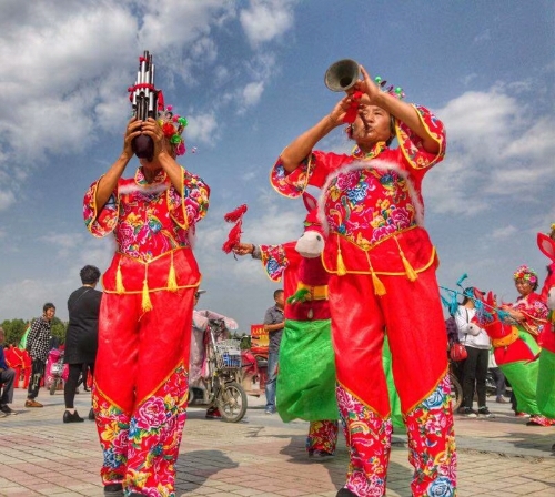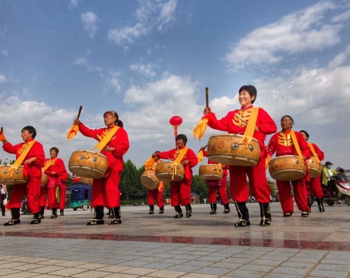 廣場上,一排排碩大的紅氫氣球高懸,氣球下縣掛著祝賀農(nóng)民豐收節(jié)的標語。穿著各種鮮艷顏色的表演服裝的民間藝術(shù)表演隊,給節(jié)日增光添彩,擂響盤鼓,為節(jié)日助威。從全縣23個鄉(xiāng)鎮(zhèn)起早趕來的46支民間藝術(shù)表演隊伍,伴隨著悠揚的音樂,喧天的鑼鼓在廣場上各顯其能。腰鼓、盤鼓、耍獅子、劃旱船、抬花轎、挑花籃、廣場舞也以不同的方式表達著豐收的喜悅。