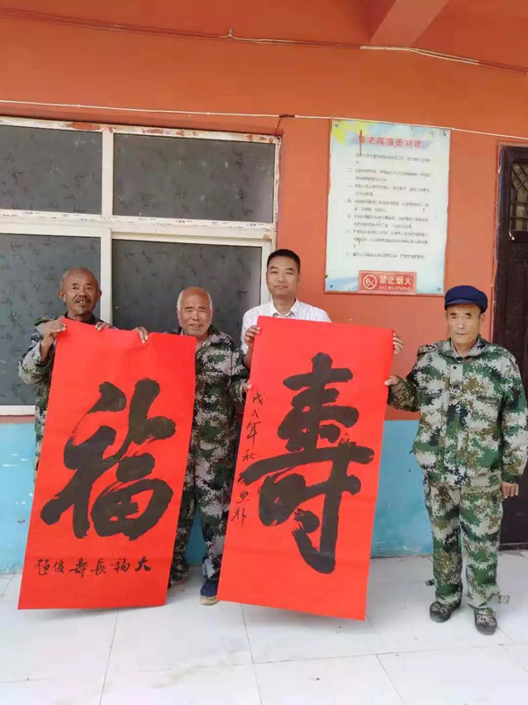 鄲城縣衛(wèi)計(jì)委駐虎崗鄉(xiāng)虎崗行政村第一書(shū)記王忠樸,是鄲城縣書(shū)法協(xié)會(huì)副主席兼秘書(shū)長(zhǎng),在他的牽線(xiàn)下,鄲城縣書(shū)法協(xié)會(huì)主席巴云山帶領(lǐng)10多名書(shū)法協(xié)會(huì)會(huì)員前來(lái)助陣,與敬老院里懂書(shū)法的老人一起揮毫潑墨。