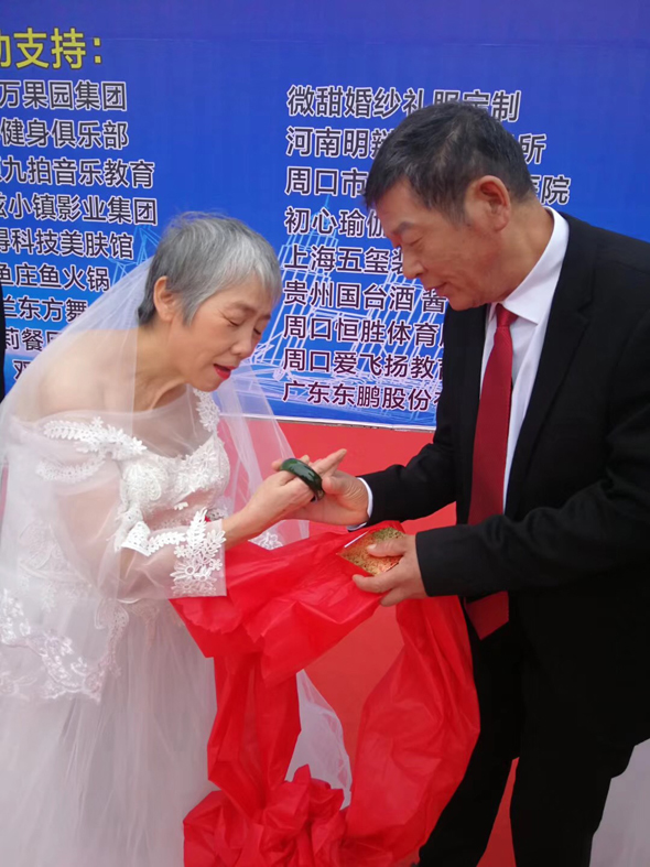 10月19日上午,在周口宏德養(yǎng)老孝道文化節(jié)上,18對(duì)老人身著盛裝參加老年集體婚禮。典禮開始后,18對(duì)老人手牽紅絲帶走上舞臺(tái),經(jīng)過(guò)現(xiàn)代式結(jié)婚典禮流程后,老人們互贈(zèng)禮物。老人們非常激動(dòng),他們相互擁抱,有的還流下了眼淚。臺(tái)下的子女也激動(dòng)萬(wàn)分,紛紛走上舞臺(tái)與自己的父母擁抱在一起。