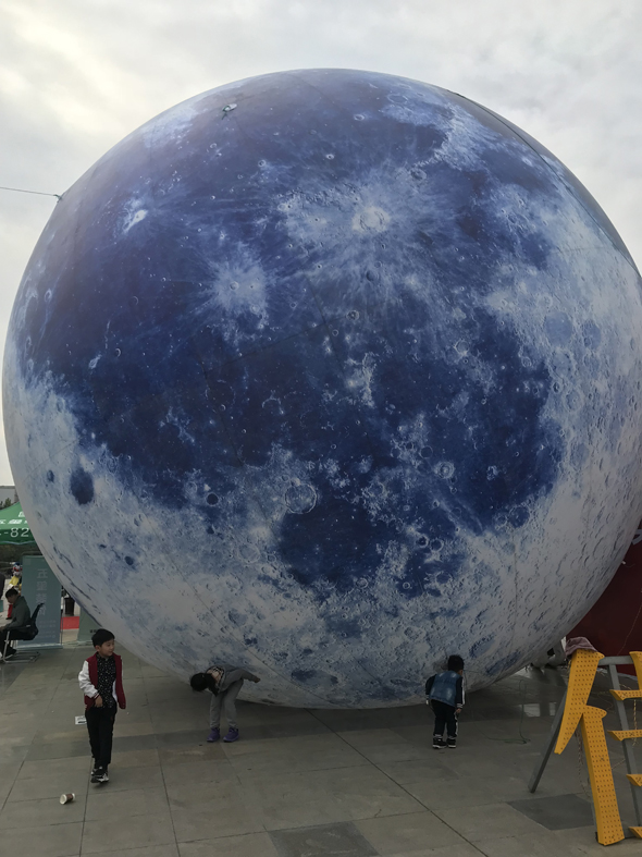 記者在現(xiàn)場(chǎng)看到,這個(gè)“大月亮”塊頭很大,擺放在展廳前。前來(lái)參加展會(huì)的市民紛紛拍照,有的市民還把它發(fā)到微信朋友圈,稱“周口有個(gè)超級(jí)大月球”。