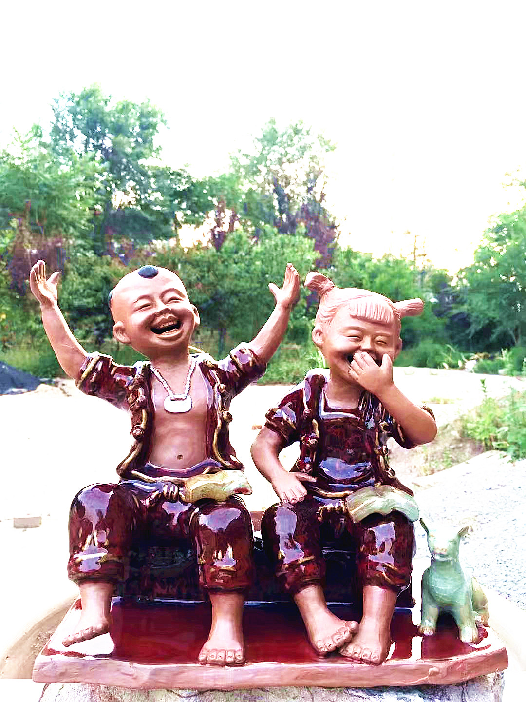 記者采訪獲悉,張振福鈞瓷泥塑作品《童話故事》,表現(xiàn)的是豫東農(nóng)村的孩子看書的情景,畫面中小男孩講述書中的童話故事,手舞足蹈,逗得小女孩開懷大笑,表現(xiàn)童真、童趣,畫面充滿著喜慶祥和,從側(cè)面反映了豫東人民的幸福生活。作品長39厘米、寬23厘米高36厘米,是張振福把泥塑和鈞瓷完美結(jié)合、使用鈞瓷礦泥,泥塑局部上釉,更具觀賞性。