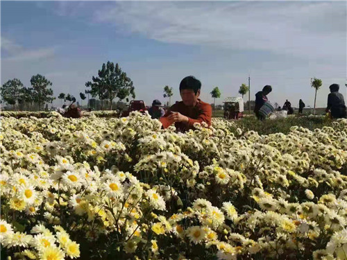 當(dāng)日,位于高集鄉(xiāng)北部的黨橋、雙堂等幾個(gè)行政村,也是熱鬧非凡。一臺(tái)臺(tái)大小不同的車輛,滿載著剛從地里摘下的鮮菊花,正往富甲一方菊花加工廠里銷售,縷縷的菊花清香隨風(fēng)飄來(lái),煞是誘人。在富甲一方合作社帶動(dòng)下,今年有16戶貧困戶種植80多畝菊花,鄉(xiāng)政府對(duì)首次種植的貧困戶負(fù)責(zé)技術(shù)培訓(xùn),并給予每畝1000元的生產(chǎn)獎(jiǎng)補(bǔ)。今年菊花每公斤4元左右,麥茬種植菊花每畝可產(chǎn)鮮菊1100-1300公斤,去掉雇人摘菊花費(fèi)用每公斤0.3元,每畝可收入4000-5000元。種植菊花的貧困戶孫建國(guó)在富甲一方收購(gòu)現(xiàn)場(chǎng),正樂(lè)呵呵的數(shù)著賣菊花得來(lái)的大把鈔票。