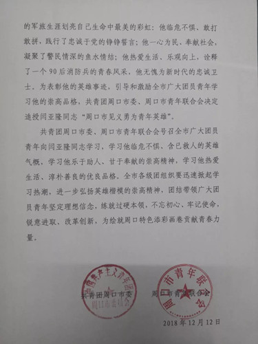12月13日,記者從鄲城縣團縣委獲悉,為表彰閆亞隆同志的英雄事跡,引導和激勵全市廣大團員青年學習他的崇高品格,共青團周口市委、周口市青年聯(lián)合會追授閆亞隆同志“周口市見義勇為青年英雄”稱號。