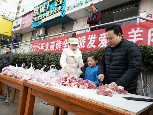 小小燒烤店門前,成了倡導(dǎo)“愛與奉獻(xiàn)主會場”。 2019年1月1日上午10點(diǎn),新年第一天,鄭州市國基路與豐慶路交叉口太康烤全羊店門口,60多名環(huán)衛(wèi)工、殘疾人、困難群眾等弱勢群體聚集在這里,排隊(duì)免費(fèi)領(lǐng)取“羊肉哥”孫合理和妻子劉曉愛派送的一份新年禮物——愛心羊肉,而這愛舉從2010年元旦開始到如今,已經(jīng)堅(jiān)持了9年。