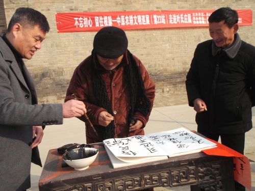 鄧城鎮(zhèn)范莊村72歲的范長印老人觀展后感觸頗深地說:“這些展品我很多都見過、用過,不過用起來真費勁真受罪?。‖F(xiàn)在農(nóng)忙季節(jié)機器一響,糧食嘩啦啦就進家了。我這個年齡的人最能體會到咱們國家的進步和社會的美好!”隨后,老人在留言薄上用握慣農(nóng)具的粗糙大手握起毛筆寫下了“新時代,得民心”幾個字。字雖不工整但他的滿腔真情感動了在場的群眾,大家把熱烈的掌聲送給范長印老人。
