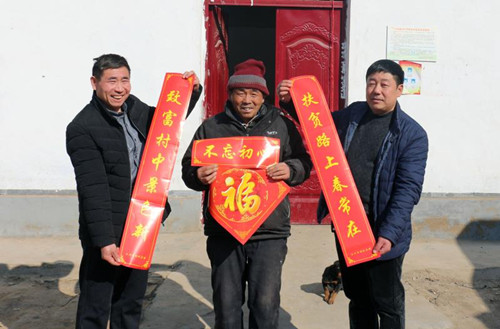 1月24日,扶溝縣白潭鎮(zhèn)王村貧困戶王奎鎖喜滋滋地從縣財(cái)政局扶貧工作人員手中接過(guò)對(duì)聯(lián)。為營(yíng)造歡樂(lè)祥和、文明有序的節(jié)日氛圍,宣傳扶貧政策,扶溝縣財(cái)政局對(duì)所幫扶7個(gè)行政村開(kāi)展“情暖萬(wàn)家·迎新春送春聯(lián)”助力脫貧攻堅(jiān)活動(dòng),以此傳達(dá)黨的十九大精神和脫貧攻堅(jiān)精神。