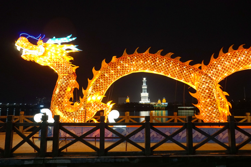 在周口公園,LED燈帶、燈網(wǎng)和霓虹燈交相輝映,遠觀如如點點繁星。放眼望去,在人工湖上一條蜿蜒30米的“中華祥龍” 昂首盤踞在吊橋上,金黃奪目,栩栩如生。
