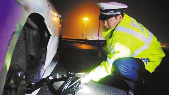 當(dāng)日21時許,市公安局交通管理支隊七大隊民警王凱偉和同事巡邏至機(jī)西高速129公里周口方向時,發(fā)現(xiàn)一輛白色福特轎車停在應(yīng)急車道上,車輛后方擺放有警示標(biāo)志,一男子蹲在車旁不知所措。見狀,王凱偉立即安排輔警柴袁龍在來車方向做好安全防范,自己下車查看情況。