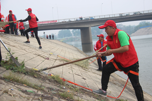 當(dāng)天上午,志愿者拿著掃帚、鐵锨等工具,對(duì)堤坡的塑料袋、礦泉水瓶等垃圾進(jìn)行清理,還有一些志愿者負(fù)責(zé)清理河堤上的垃圾。雖然垃圾雜物又臟又臭,但是志愿者相互協(xié)作,干得熱火朝天。