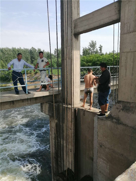 順著喊聲方向,他跑到河閘邊,發(fā)現(xiàn)一男子騎在距水面約半米的閘門(mén)上,側(cè)身彎腰拉著一在水中掙扎的女青年。河面很寬,從上流奔騰而下的水匯集到閘門(mén)前,由于河道變窄流得很急。女青年的一只手被男子牢牢拉住,身體在深4米多的水中四處晃擺。男子體力消耗很大,有點(diǎn)堅(jiān)持不住,不住地抬頭呼救。