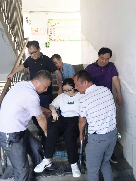 原來(lái),6月22日夜晚,實(shí)驗(yàn)中學(xué)考生晉淼突患急性闌尾炎,住院動(dòng)了手術(shù)后,身體十分虛弱,只得通過(guò)輪椅“行走”。家長(zhǎng)看著心疼,就勸她安心養(yǎng)病,明年再考,但晉淼堅(jiān)持參加考試。25日中考開(kāi)考首日,晉淼在家人陪護(hù)下,坐著輪椅來(lái)到實(shí)驗(yàn)中學(xué)考點(diǎn)。由于規(guī)定考生家長(zhǎng)不得進(jìn)入考場(chǎng),實(shí)驗(yàn)中學(xué)考點(diǎn)負(fù)責(zé)人商議后決定,由學(xué)校考務(wù)人員承擔(dān)把她抬進(jìn)考場(chǎng)的“任務(wù)”?!昂⒆咏唤o我們,您就放心吧。”望著被抬進(jìn)考場(chǎng)的女兒,晉淼的家人欣慰地笑了。