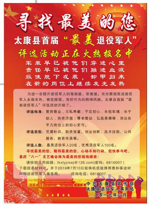 為進一步提升退役軍人的尊崇感、榮譽感,充分展現全縣退役軍人永葆本色、奮發(fā)圖強、有所作為的精神風貌,太康縣委宣傳部、太康縣退役軍人事務局從即日起聯合開展首屆“最美退役軍人”評選活動,對全縣退役軍人中涌現出來的黨建標兵、脫貧致富、創(chuàng)業(yè)創(chuàng)新、技術技能、公共服務、教育傳承等方面典型代表進行評選表彰。