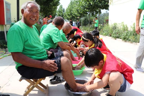 7月的太康,酷熱難耐。6日上午8時許,一輛公交車穩(wěn)穩(wěn)停靠在太康縣芝麻鄉(xiāng)敬老院門口,車上下來20多名身穿紅馬甲的學(xué)生志愿者,他們抬著米、面、油和雞蛋等物品走進(jìn)敬老院。坐在門口等候的老人們,樂呵呵地上前迎接客人。整個敬老院一下子熱鬧起來。放下物品,孩子們立馬開始勞動,他們從老人們宿舍搬出馬扎、板凳,在院中擺放安穩(wěn),扶著老人坐上去,開始給老人洗腳。正上初中一年級的李博泉細(xì)心地幫72歲的張照志老人摳掉趾甲縫和腳底的污垢。張老漢流淚了:“這輩子有人給我洗腳,我真是不知道哪修來的福氣……”