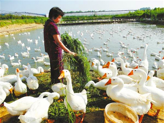 7月16日,沈丘縣周營鎮(zhèn)馬營村生態(tài)鵝養(yǎng)殖基地,工人正在喂養(yǎng)生態(tài)鵝。近年來,該鎮(zhèn)充分利用得天獨厚的生態(tài)環(huán)境優(yōu)勢,積極引導(dǎo)群眾發(fā)展訂單生態(tài)土雞、肉鵝、槐山羊等特色養(yǎng)殖產(chǎn)業(yè),全力促進農(nóng)民增收致富。謝辛凌 攝