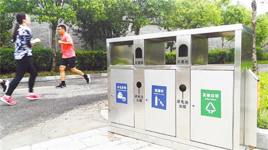 7月18日7時許,晨練的市民從周口公園安裝不久的新型分類垃圾桶旁跑過。
