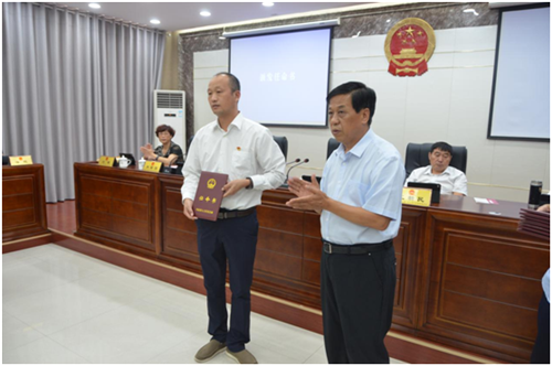 會(huì)議組織新任命的國(guó)家機(jī)關(guān)工作人員向憲法宣誓,李國(guó)際為新任命的國(guó)家機(jī)關(guān)工作人員頒發(fā)了任命書(shū)。