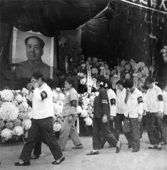 廣播喇叭一直轉(zhuǎn)播著中央人民廣播電臺的節(jié)目,哀樂一遍遍響起,回蕩在大街小巷、城鎮(zhèn)鄉(xiāng)村,大家不約而同地佩戴黑紗,自發(fā)做白花、扎花圈、寫挽聯(lián),商店里的白紙和黑布都賣缺了。機關(guān)單位的同志在自己布置起來的靈堂里悼念毛主席,學生每天上課之前都向毛主席默哀,工廠里掛起了“繼承毛主席遺志,抓革命、促生產(chǎn)”的橫幅,農(nóng)民佩戴著黑紗在田野里勞動。