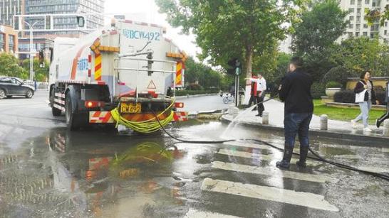 10月20日,中心城區(qū)慶豐路與周口大道交叉口處,市城鄉(xiāng)一體化示范區(qū)工作人員正在清洗路面。近日,我市有關部門抽調(diào)人力清洗路面,美化環(huán)境,城市變美了,市容變靚了。