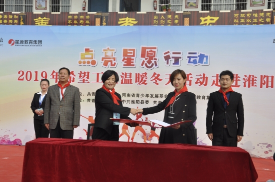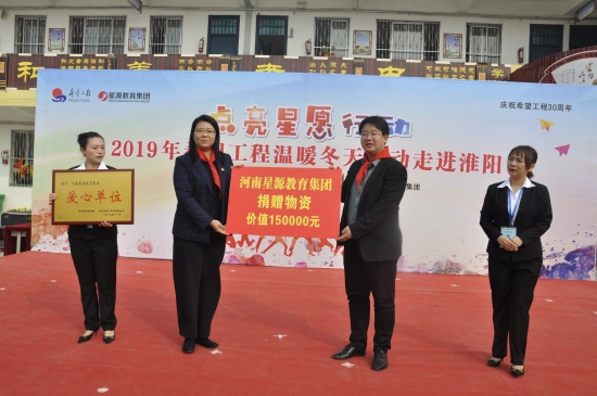 11月8日,由共青團河南省委、河南省青少年發(fā)展基金會、河南星源教育集團主辦,共青團周口市委、中共淮陽縣委、共青團淮陽縣委承辦的慶祝希望工程30周年“點亮星愿行動”2019年希望工程溫暖冬天活動走進淮陽在淮陽縣城關鎮(zhèn)北關學校隆重舉行。