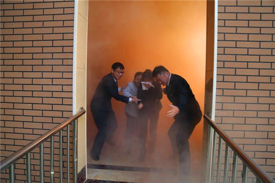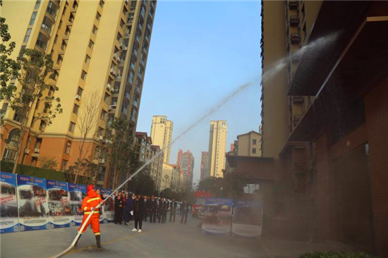 記者在現(xiàn)場看到,隨著消防警鈴的響起、煙霧的彌漫,來自物業(yè)公司和社區(qū)的數(shù)十名群眾彎著腰,同時用濕毛巾捂著口鼻,緊急而有序地從步梯撤出,與此同時,消防隊(duì)員迅速將消防水袋和槍頭同消防栓相連接,并打開消防栓對準(zhǔn)“火勢”,一瞬間,發(fā)生在建業(yè)社區(qū)的一場“火災(zāi)”被及時撲滅,現(xiàn)場圍觀的眾人爆發(fā)出陣陣掌聲。